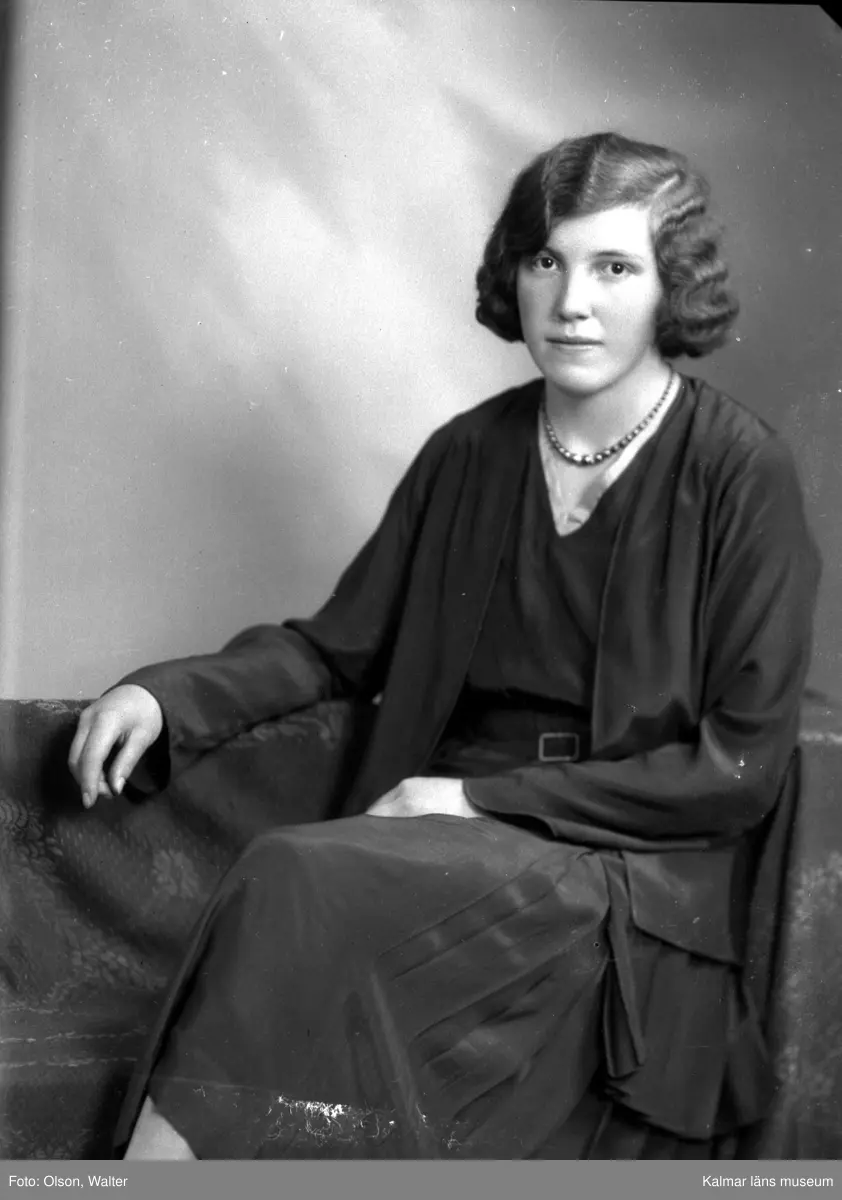 Ateljébild på en kvinna i halsband, blus och jacka. Enligt Walter Olsons journal är bilden beställd av Astrid Hansson.