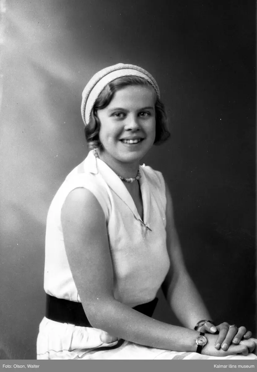 Ateljébild på en kvinna i halsband och klänning. Enligt Walter Olsons journal är bilden beställd av Inga Lindén.