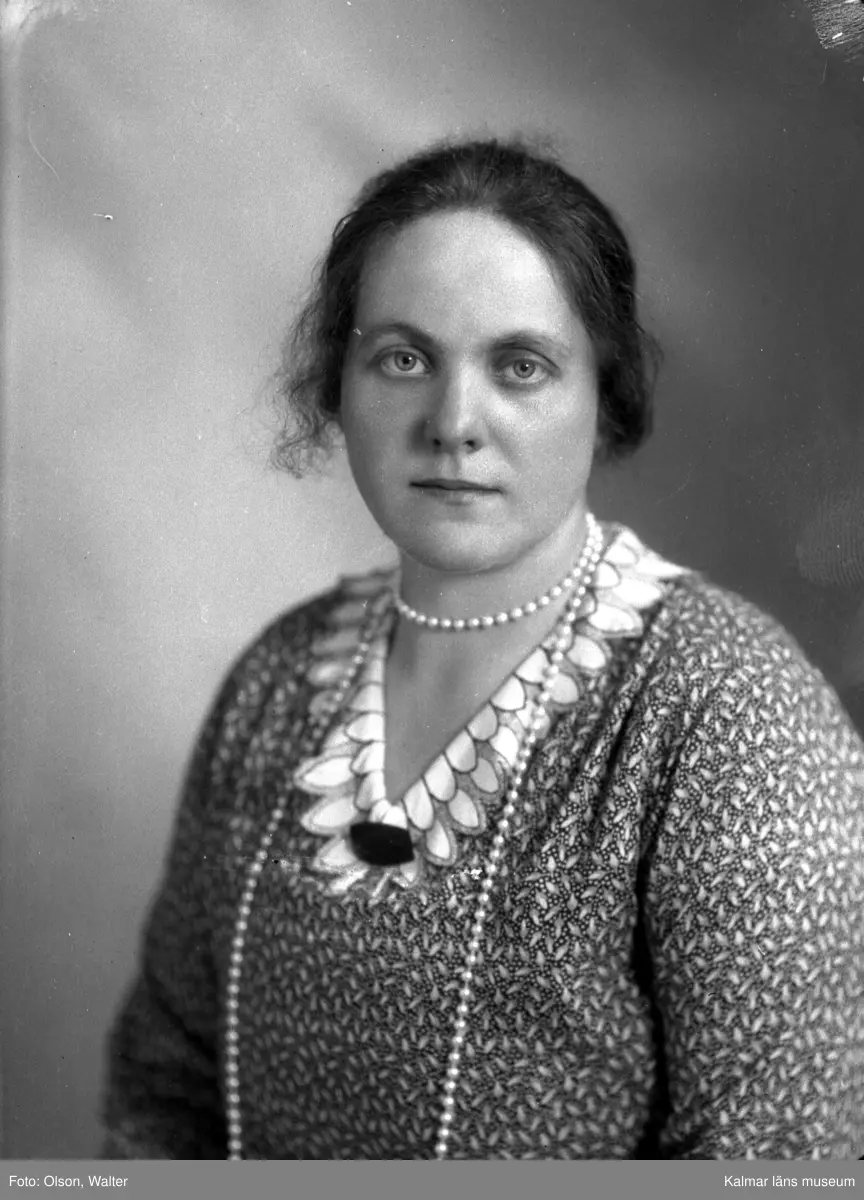 Ateljébild på en kvinna i halsband och brosch. Enligt Walter Olsons journal är bilden beställd av fru Gottfrid Johansson.