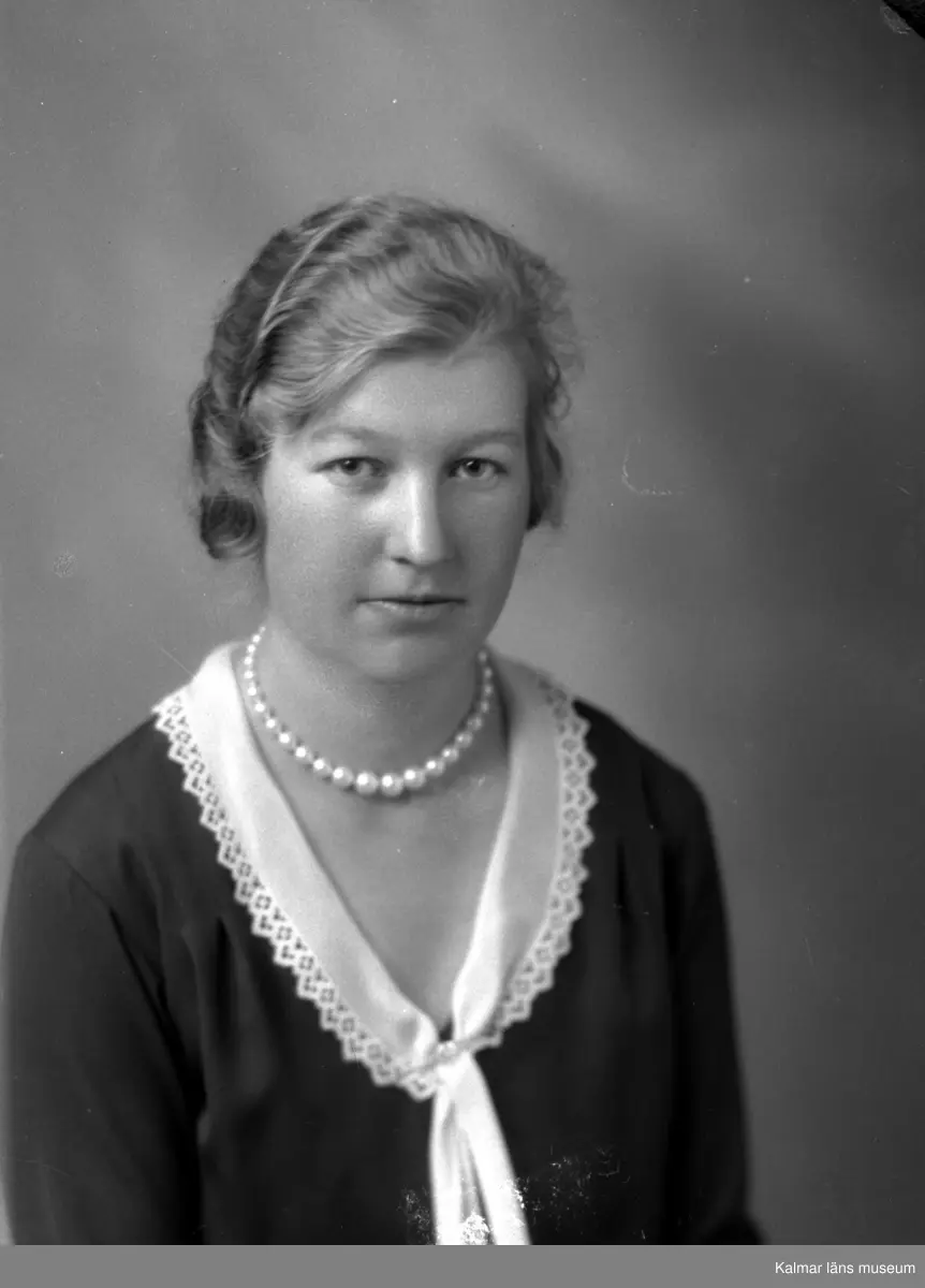 Ateljébild på en kvinna i halsband och spetskrage. Enligt Walter Olsons journal är bilden beställd av Anna Karlsson.