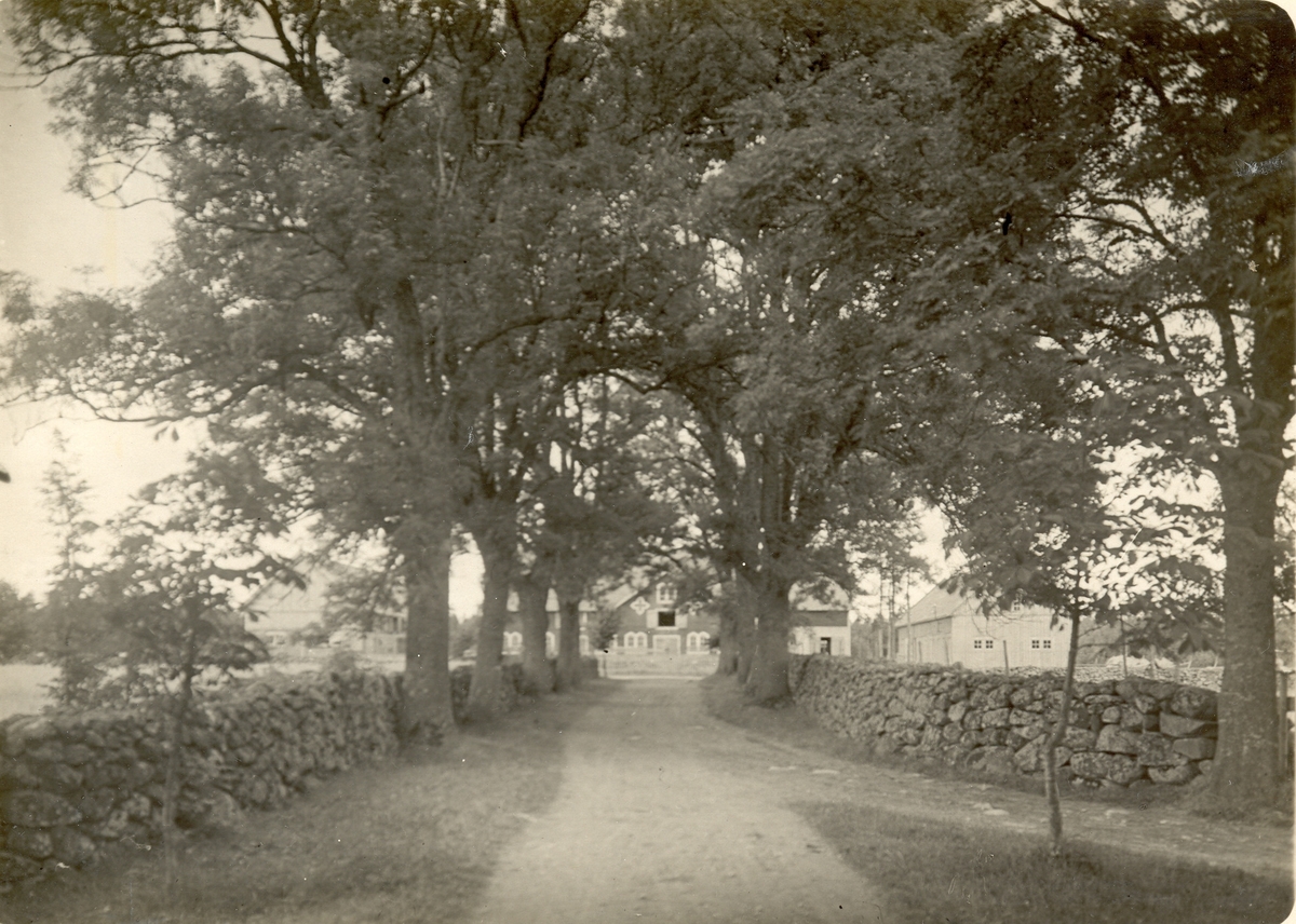 "Uppfarten till gården från manbyggnaden, allé med askar. Å sidorna stenmurar- I fonden ladugården."