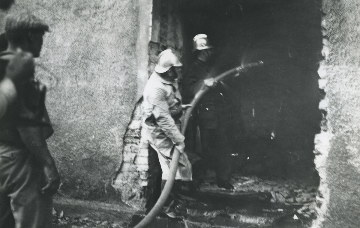 Ångkvarnen i Kalmar. Branden juli månad 1935. Brandmän sprutar vatten när folk kollar på.