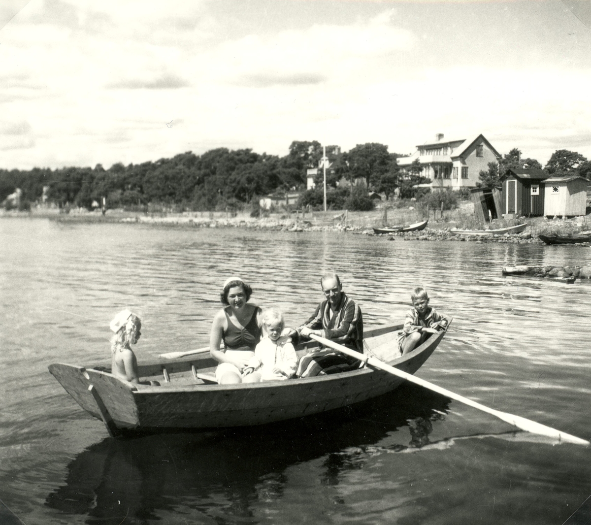 Roddtur vid stranden väster om lotsplatsen med badstranden längre bort. Tandläkare Sandbergs hus i blickfånget.