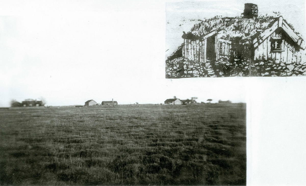 Stugorna nedanför Segerstads kyrka. Från vänster: Sanders, Köls, Måns Ants, Mor Karins och Niklas.