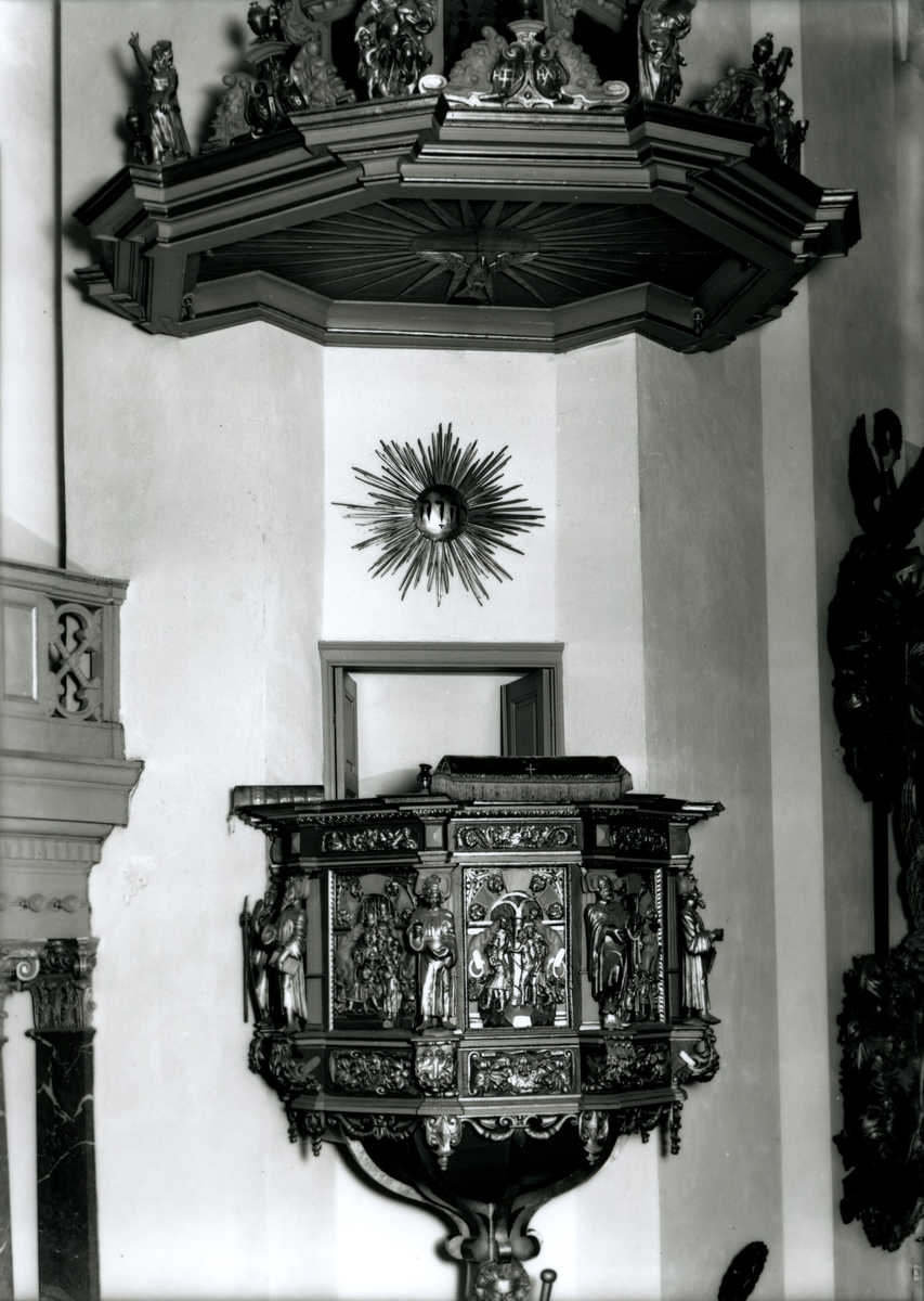 Kalmar domkyrka med predikstol, strålsol och balkakin.