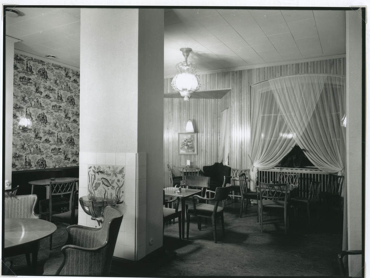 Holmgrens konditori. Servering med handfat, stolar och bord.
