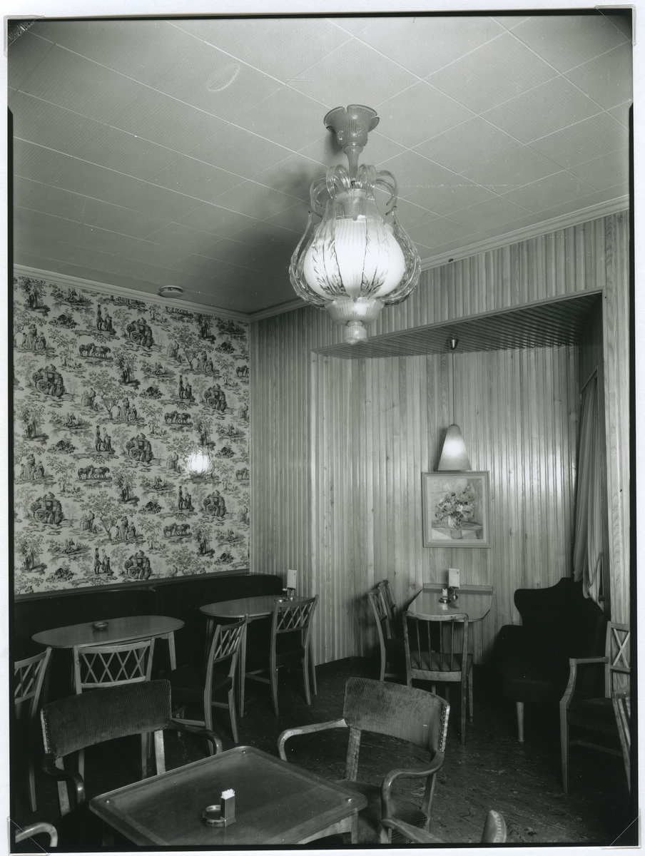 Holmgrens konditori. Servering med stolar, bord, soffor och lampor.