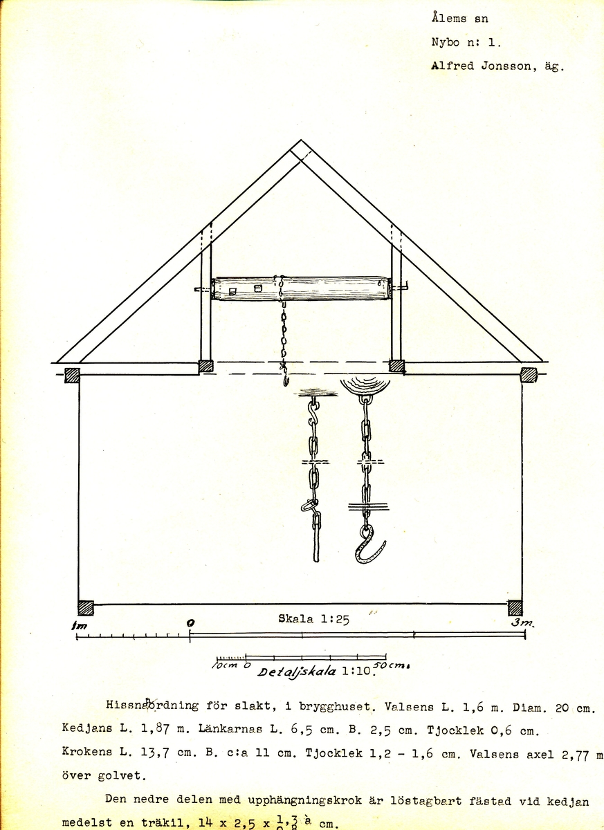 Hissanordning för slakt, i brygghuset. Valsens längd 1,6 meter, diameter 20 cm. Kedjans längd 1, 87 meter. Länkarnas längd 6,5 cm, bredd 2, 5 cm. Tjocklek 0,6 cm. Krokens längd 13,7 cm, bredd ca 11 cm. Tjocklek 1,2-1,6 cm. Valsens axel 2, 77 meter över golvet. Den nedre delen med upphängningskrok är löstagbart fästad vid kedjan medelst en träkil, 14x2,5x1,3 respektive 0,8 à cm. Upphissning sker med hävstänger, som växelvis sticks genom de tre hålen i valsen./ Martin Dyfverman, juli 1937-maj 1938.