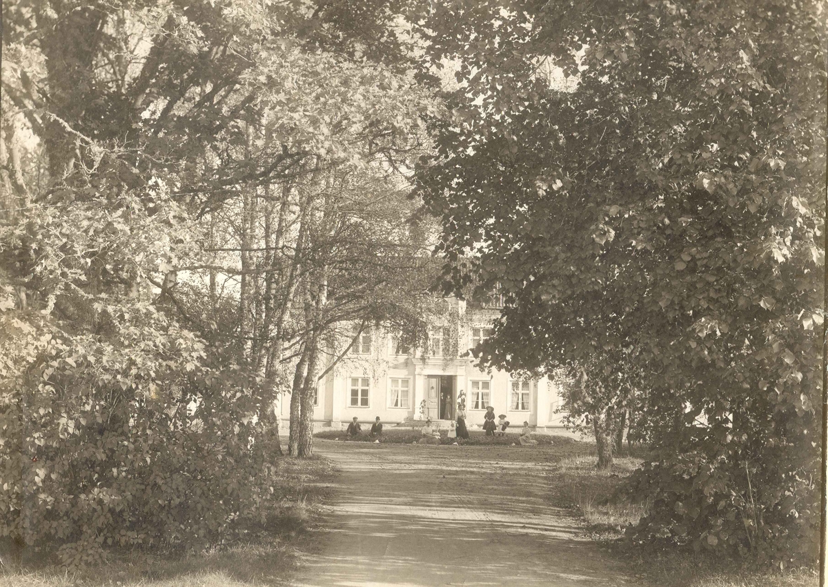 Huvudbyggnaden på Råsnäs herrgård skymtar bakom alléns träd.