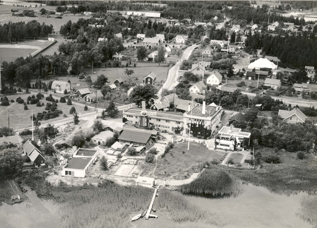 Flygfoto över Timmernabben. Gabrielverken med väderkvarn strax under bildens mitt.