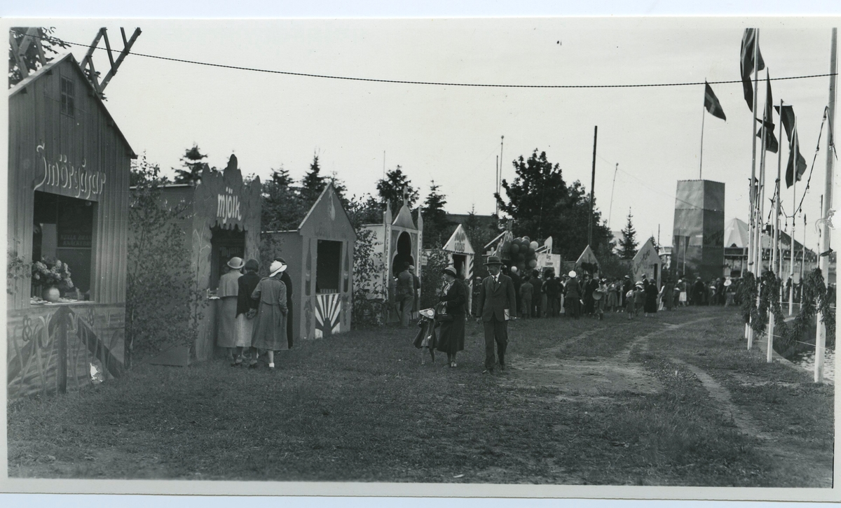 Firande av Barnens Dag i Kalmar 1935. Marknadsstånd, försäljning av mjölk, smörgåsar med mera.