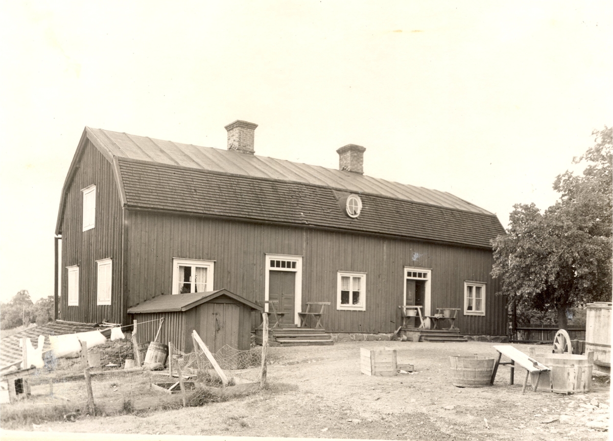 Södra flygeln mot gårdsplanen. Till vänster lång svale = nergång till mejeriet i källarvåningen. Panelat rött timmerhus under brutet tak.