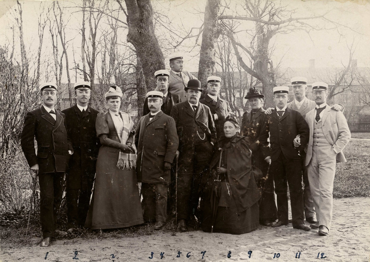 1. Karl Gustav Andersson, juridikstuderande, (Gestr. häls.), 2. Erik Kremse, filosofie studerande, Stockholm, 3. Inger, troligen student (Östergötland), 4. Ernst Lager, Stockholm, 5. Gabriel Falkenberg, troligen filosofie kandidat, Kalmar, 6. F. handlaren, 7. juridikstuderanden Vicktor Dryselius (Gestr. häls.), 8. fru Amalia Hallerström, 9. hennes syster, fröken Lotten Lundberg, 10. Norinder, medicine studerande, 11. Karl Wykström, juridikstuderande, Kalmar, 12. Setraeus, filosofie kandidat.