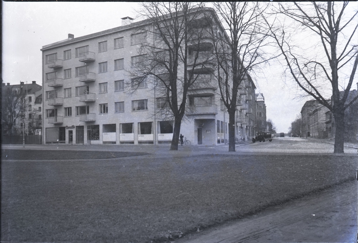 Bilden skannad från glasplåt.Publicerad i Barometern 1938. Södra vägen nuvarande Länsförsäkringarhuset.