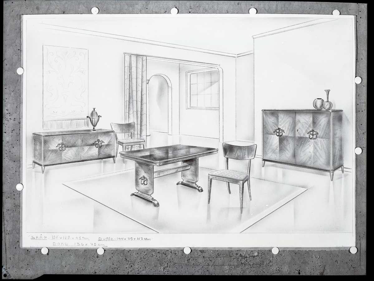Teckning visande matsalsmöblemang. Två stolar saknas.