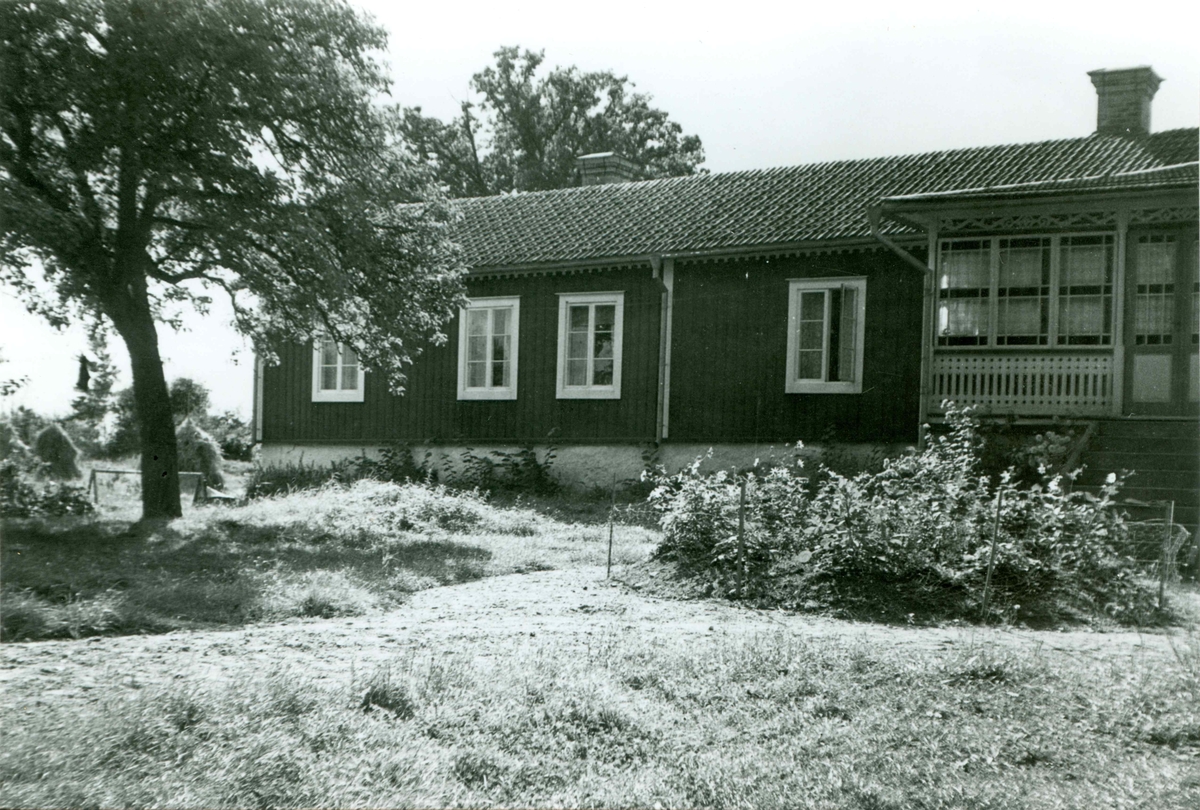 Manbyggnaden. Knuttimrad, klädd med panel av stående bräder med täcklister. Tak av 2-kupigt tegel. Rödfärgar med vita knutar, dörr- och fönsterfoder samt vitt takskägg och vita vindskivor. Glasverandan målad i vitt och brunt. Den övre bilden visar husets ursprungliga del, den undre även tillbyggnaden åt vänster.