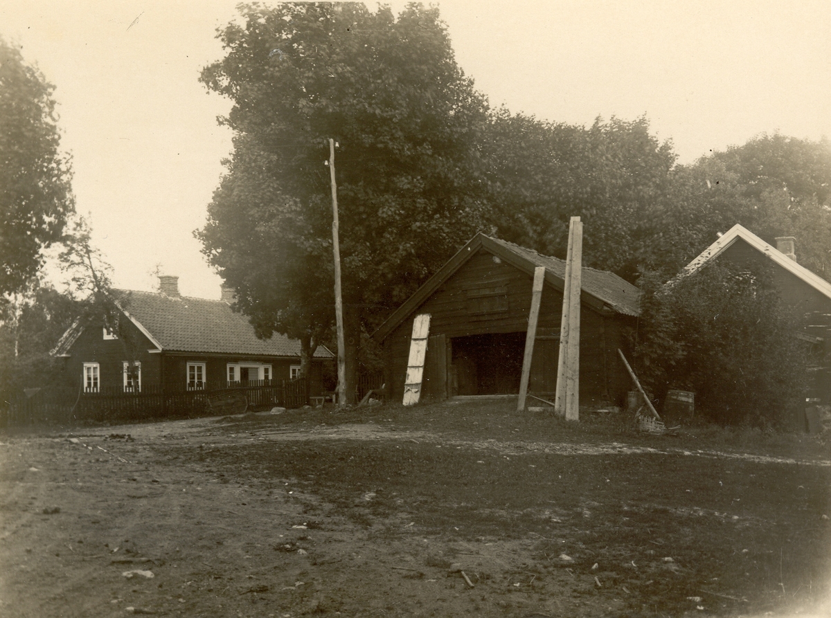 "I mitten gammal ved- eller vagnbod med källare under. Av timmer i korsknut. Tak på åsar."