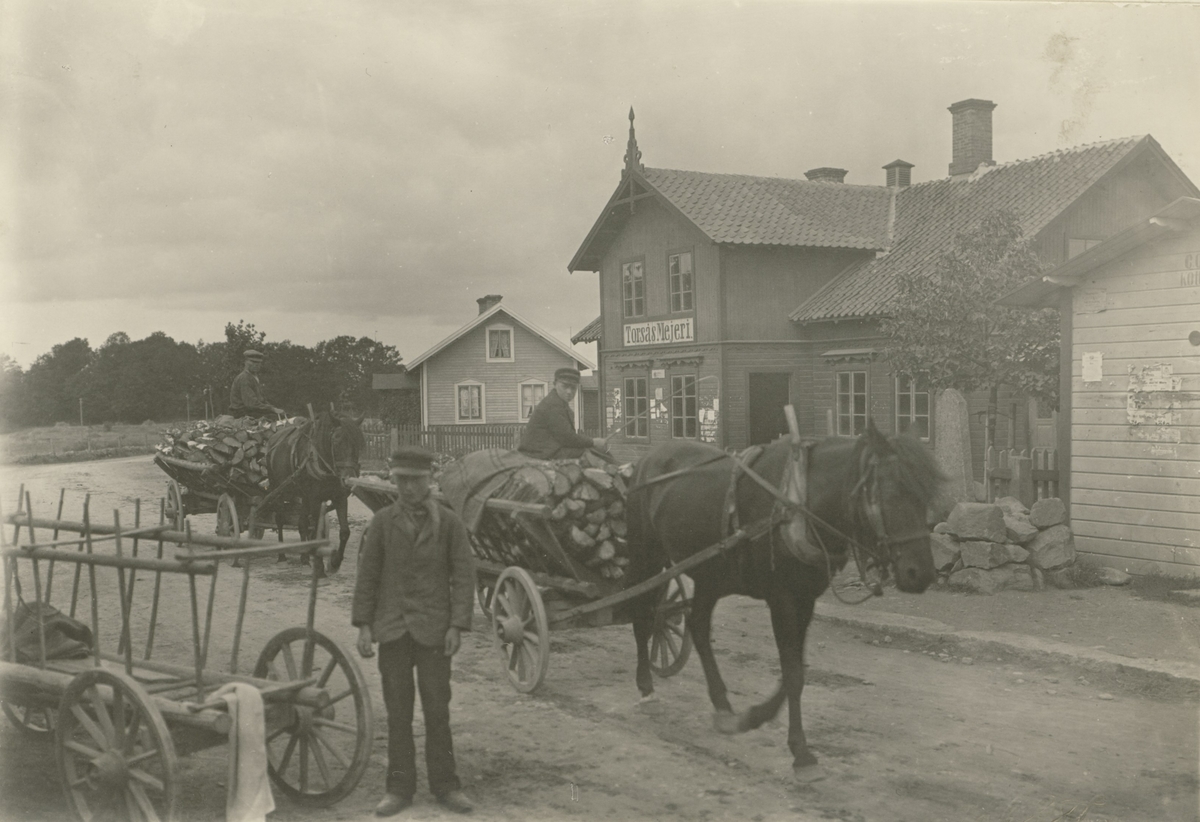 Hästtransport av vedhäckar utanför mejeriet i Torsås.