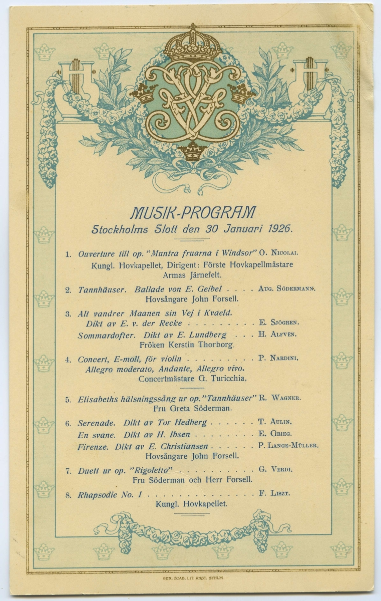 Musikprogram. Stockholms Slott den 30 januari 1926.