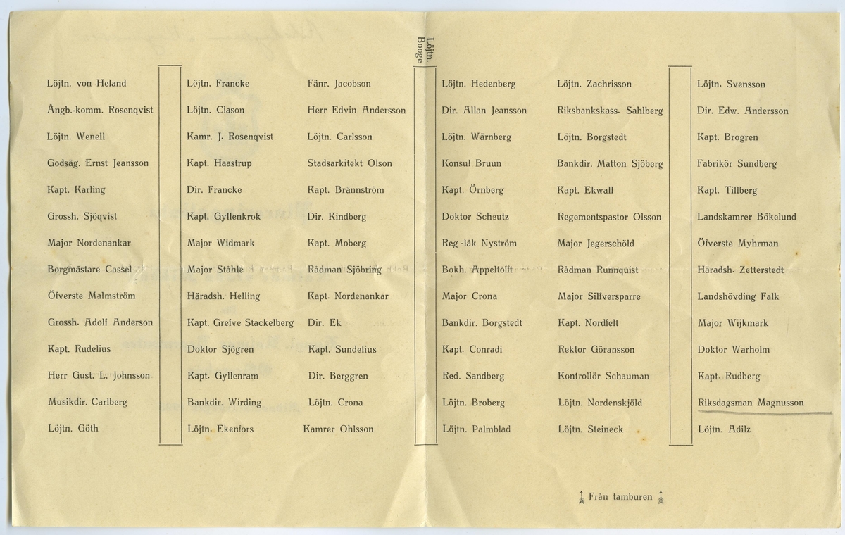 Fänrik Jacobsson, herr Edvin Andersson, löjtnant Carlsson, stadsarkitekt Olson, kapten Brännström, direktör Kindberg, kapten Moberg, rådman Sjöbring, kapten Nordenankar, direktör Ek, kapten Sundelius, direktör Berggren, löjtnant Crona, kamrer Ohlsson, löjtnant Booge, löjtnant Hedenberg, direktör Allan Jeansson, löjtnant Wärnberg, konsul Bruun, kapten Örnberg, doktor Scheutz, regementsläkare Nyström, bokhandlare Appeltofft, major Crona, bankdirektör Borgstedt, kapten Conradi, redaktör Sandberg, löjtnant Palmblad.