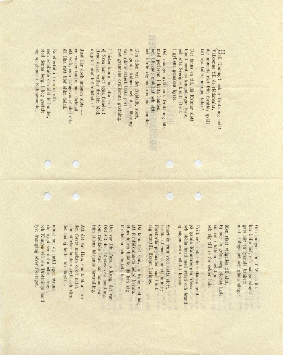 Hyllningssång (hyllningsdikt?) till kungaparet, till skålen för kungen och drottningen vid festen på Kalmar slott den 8 augusti 1874 med anledning av invigningen av Kalmar järnväg.