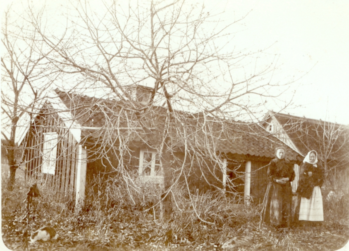 Två kvinnor utanför en enkelstuga i Mellanmon.