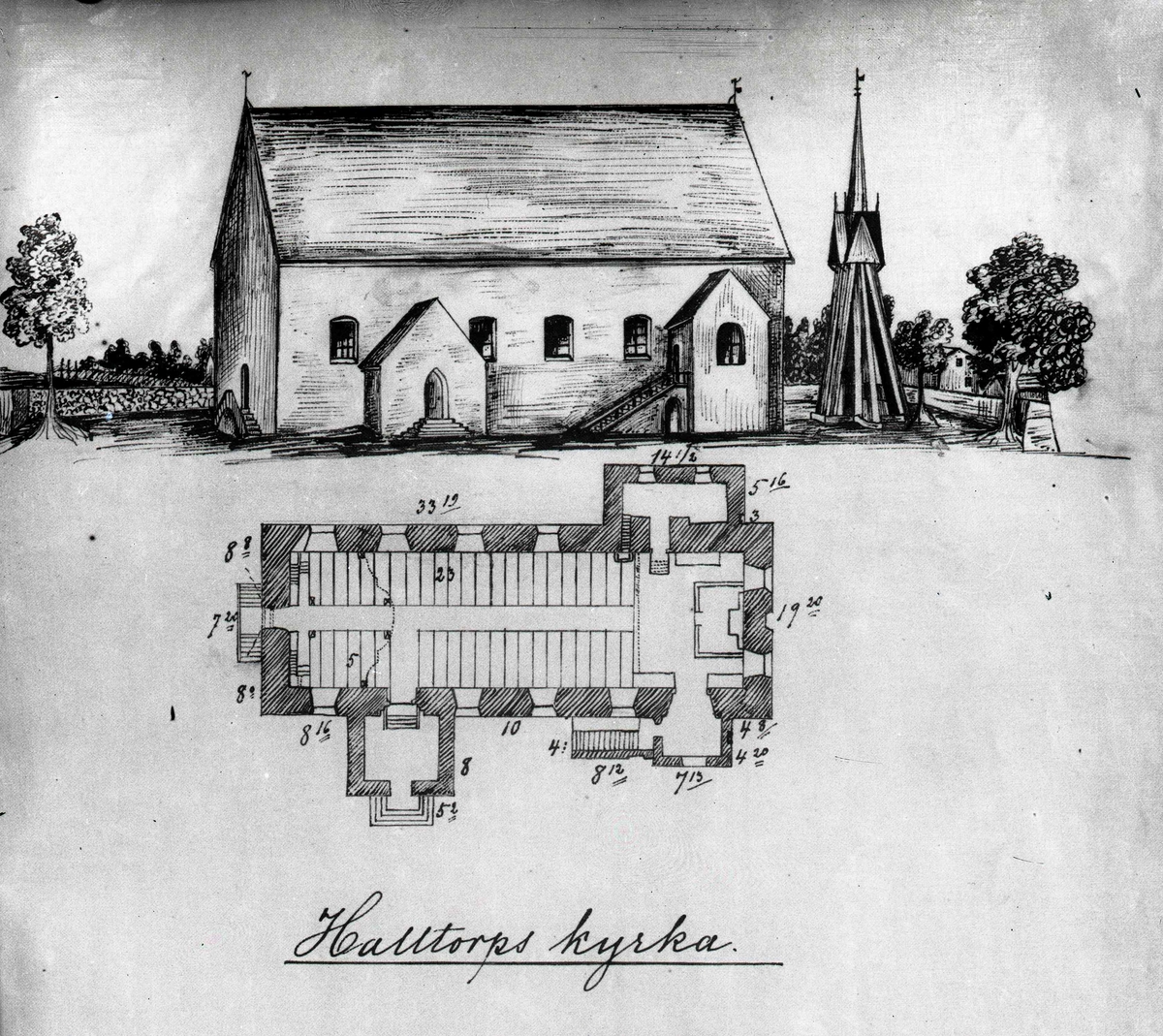 Teckning av Halltorps medeltidskyrka.
