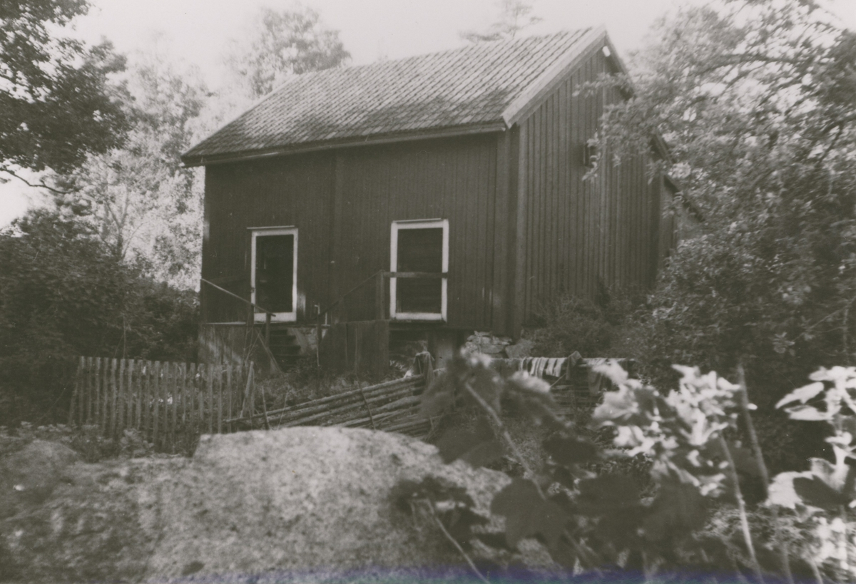 Knuttimrat magasin klätt med panel av stående bräder med täcklister, tak av tvåkupigt tegel. Rödfärgat med vita dörrfoder och svarta dörrar.