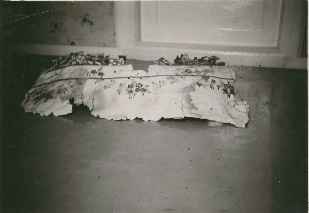 Fragment av en gammal tapet, funnen hos A. Larsson, Långeruda. Vit botten, rött, grönt och blått i rankan.