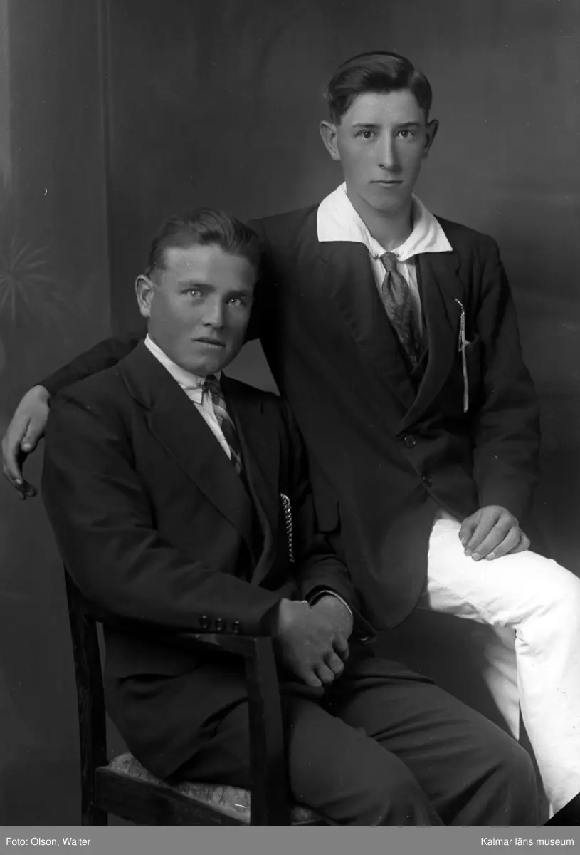 Ateljébild på två män med ur i fickan. Enligt Walter Olsons journal är bilden beställd av Arthur Lindström ifrån Bullebro.