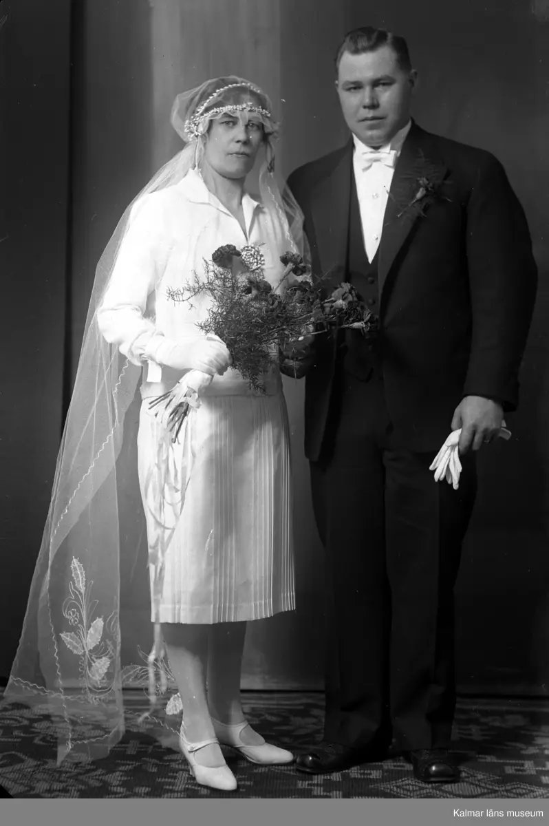 Bröllopsbild. Kvinnan har slöja och håller i en blombukett. Enligt Walter Olsons journal är bilden beställd av Verner Nilsson.