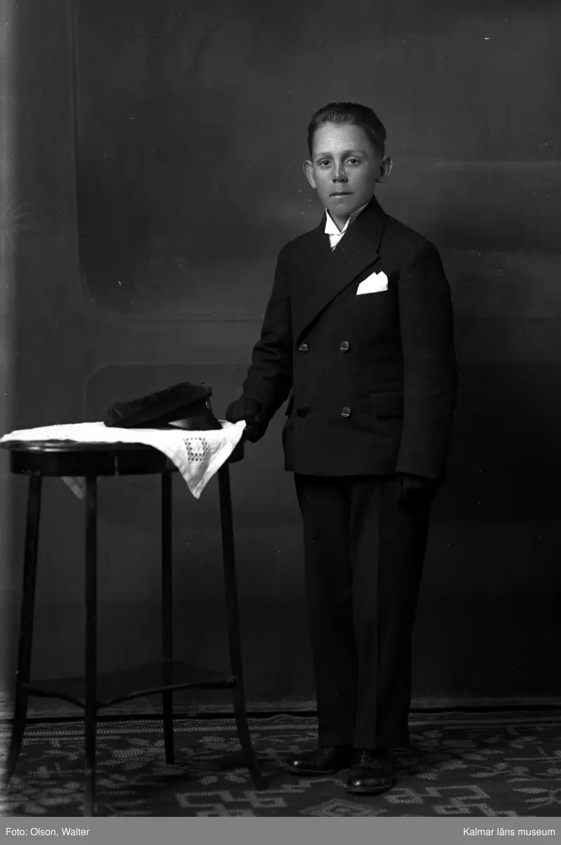 Ateljébild på en pojke i kostym. Enligt Walter Olsons journal är bilden beställd av Liss Melin.
