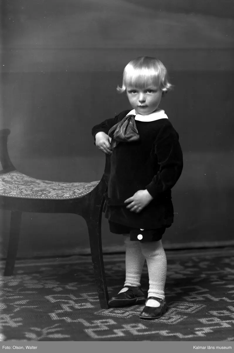 Ateljébild på en pojke bredvid en pall. Enligt Walter Olsons journal är bilden beställd av fru Vivi Cederquist.