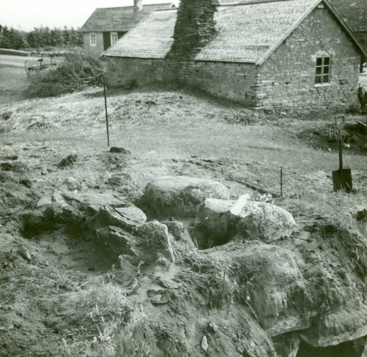 Klumpstenar och hällar över en hällkista. I bakgrunden syns smedjan.