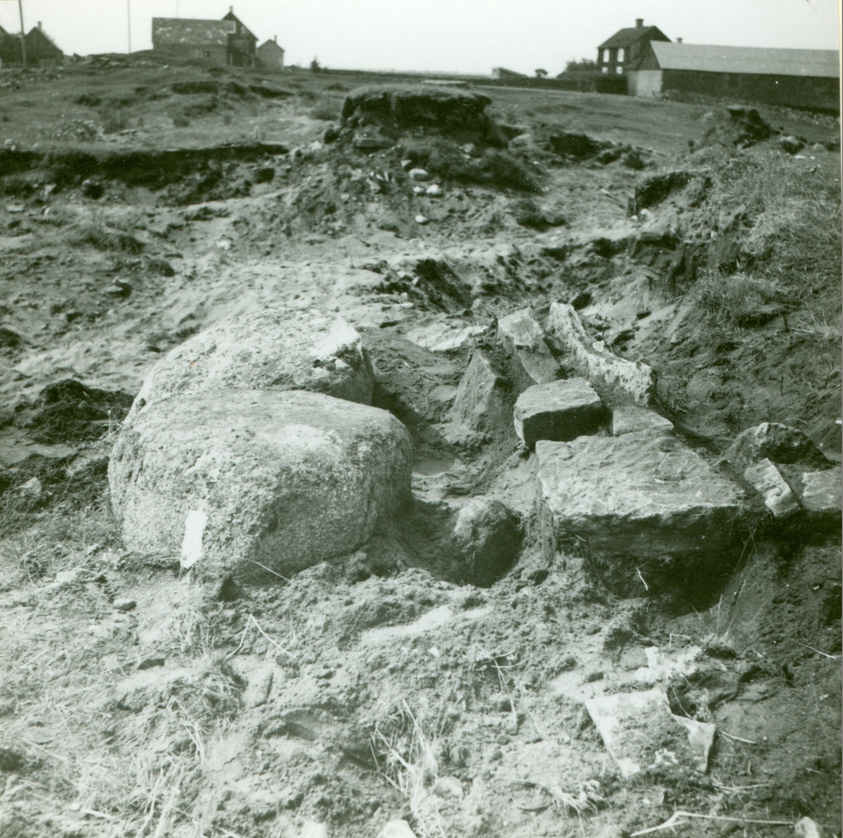 Klumpstenar och hällar över en hällkista. I bakgrunden syns smedjan.