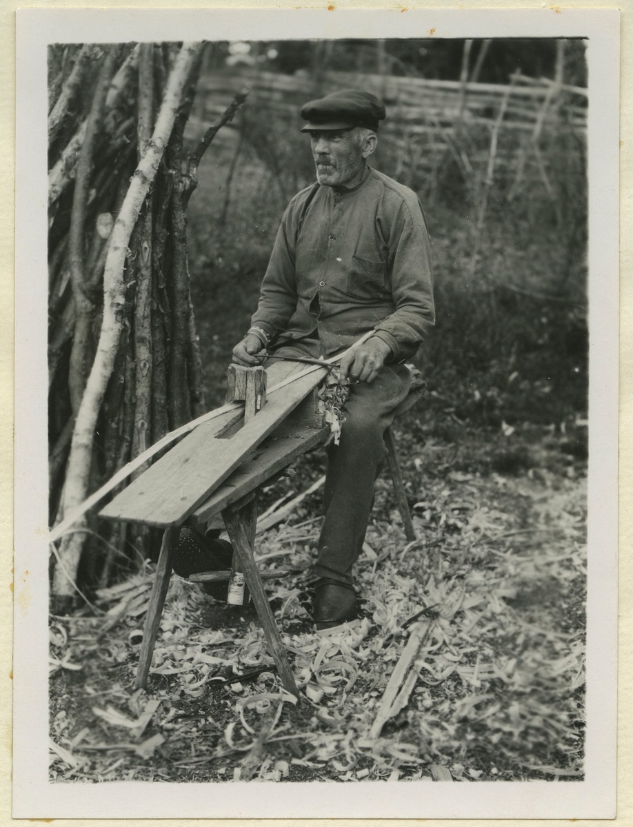 Korgmakaren Johan Ek på torpet Skogstorp utanför Orrefors tillverkar vidjor som ska användas till korgflätning.