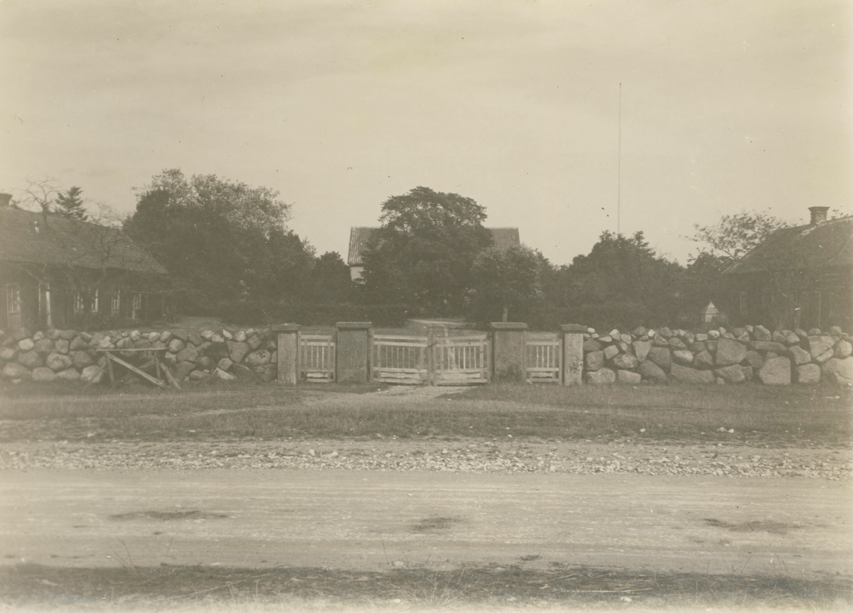 Gården från landsvägen. Närmast ligger mangårdens vidsträckta yttre plan med de två långa flyglarna samt stenmuren och grinden mot landsvägen. Innerst ligger mangårdens inre plan, som skiljes från den yttre medelst häck. Mitt för huvudbyggningen, vars tak skymtar, står en vacker alm såsom vårdträd med lummiga buskage på sidorna.