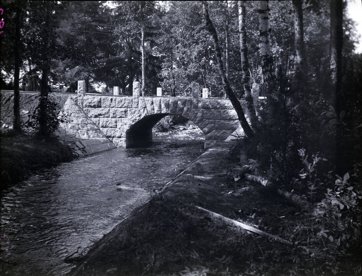 Nya landsvägsbron, Lövås. Den är byggd av huggen sten i kallmur. Räcken har inte än kommit på plats. Bron är över Tunaåns utlopp i Tunasjön. Byggd av huggen sten 1932 av AB Vägförbättringar.