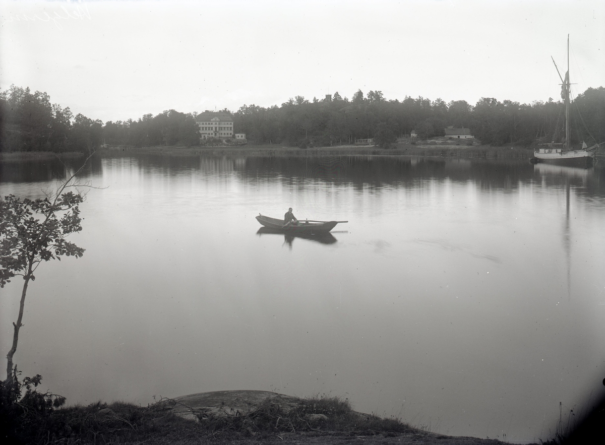 Vy över viken med huvudbyggnaden i fonden. I båten Charles Cahier.