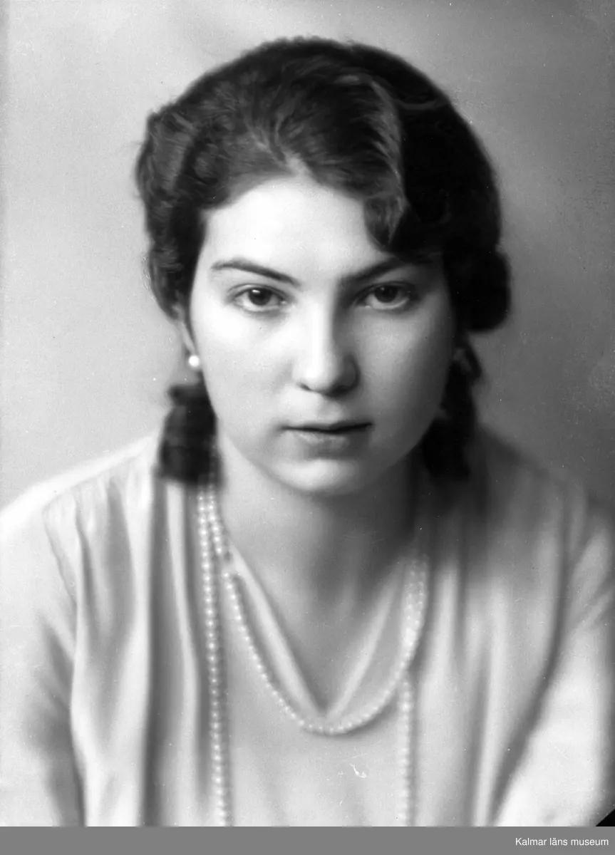 Ateljébild på en kvinna i pärlhalsband och jumper. Beställare till bilden: Fröken Anna-Lisa Karlsson ifrån Kalmar.