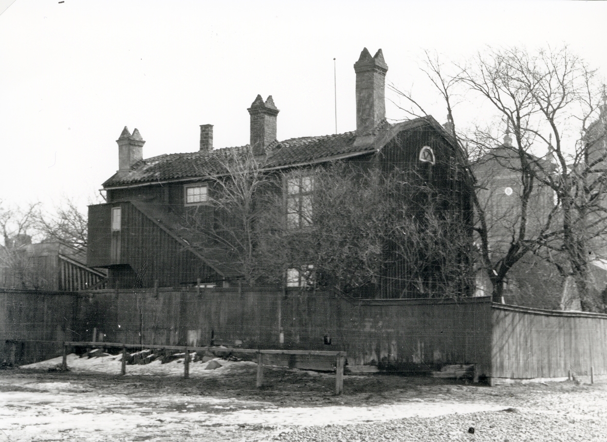 Baksidan på Thernströmska huset som var byggt tvärs över Västra Sjögatan och revs när Fredriksskansbron byggdes.