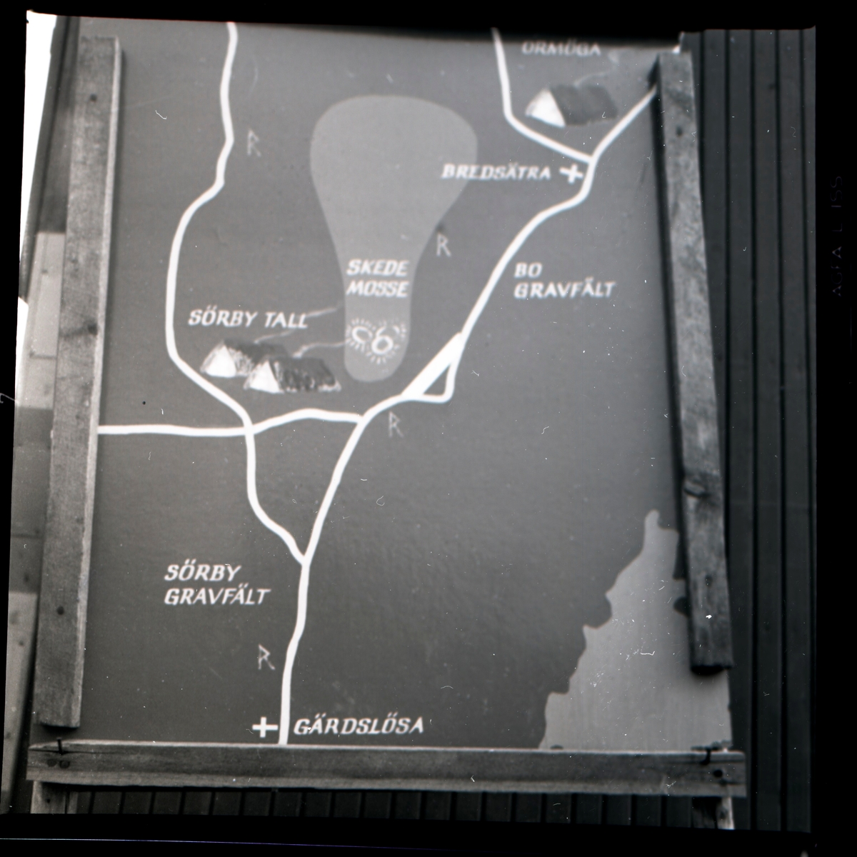 Titel: Karta över arkeologiska undersökningar från Ormöga i norr till Störlinge gravfält i söder med Skedemosse i mitten.