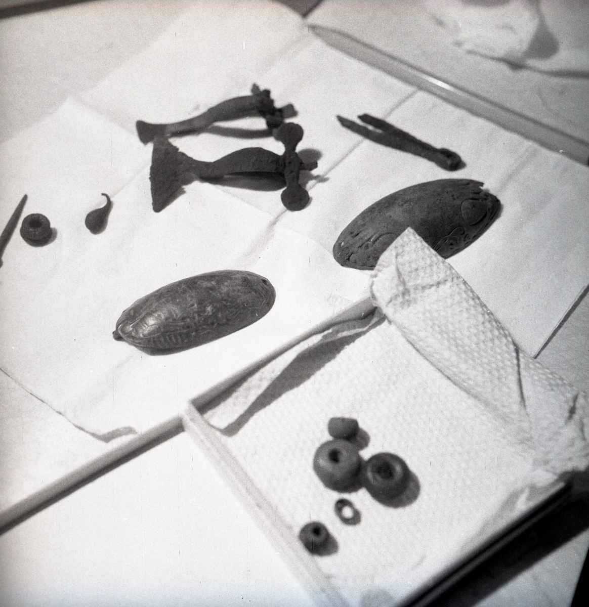 Föremål från utgrävningar vid Hässleby. Bland annat en pincett, sländtrissor och spännen.