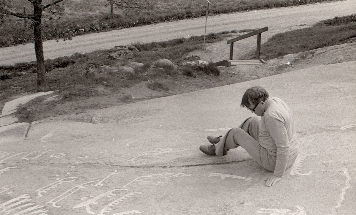 En man som studerar hällristningar. Hällristningsområdet i Tanum är ett område i Tanums kommun i Bohuslän där man funnit flera berghällar med stora mängder hällristningar från bronsåldern. Runt den största av dem, Vitlyckehällen, är Vitlycke museum uppbyggt. Hällen har närmare 300 inhuggna figurer och ca 170 skålgropar. Den kanske mest berömda scenen bland alla Tanums hällristningar, "Brudparet", finns här. Bland de övriga närliggande hällarna märks Litsleby med en ca 2,3 meter lång spjutbeväpnad man, "Spjutguden", och Aspeberget med en plöjningsscen, ett antal oxar och skepp. Hällen vid Fossum ligger en bit från de övriga. Den kännetecknas av en mer sammanhållen och konstnärlig komposition. Kanske är den gjord av en enda ristare.