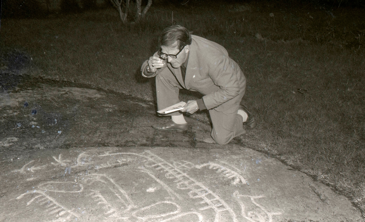 Bild på Hovåsristningen. En man studerar hällristningar.
