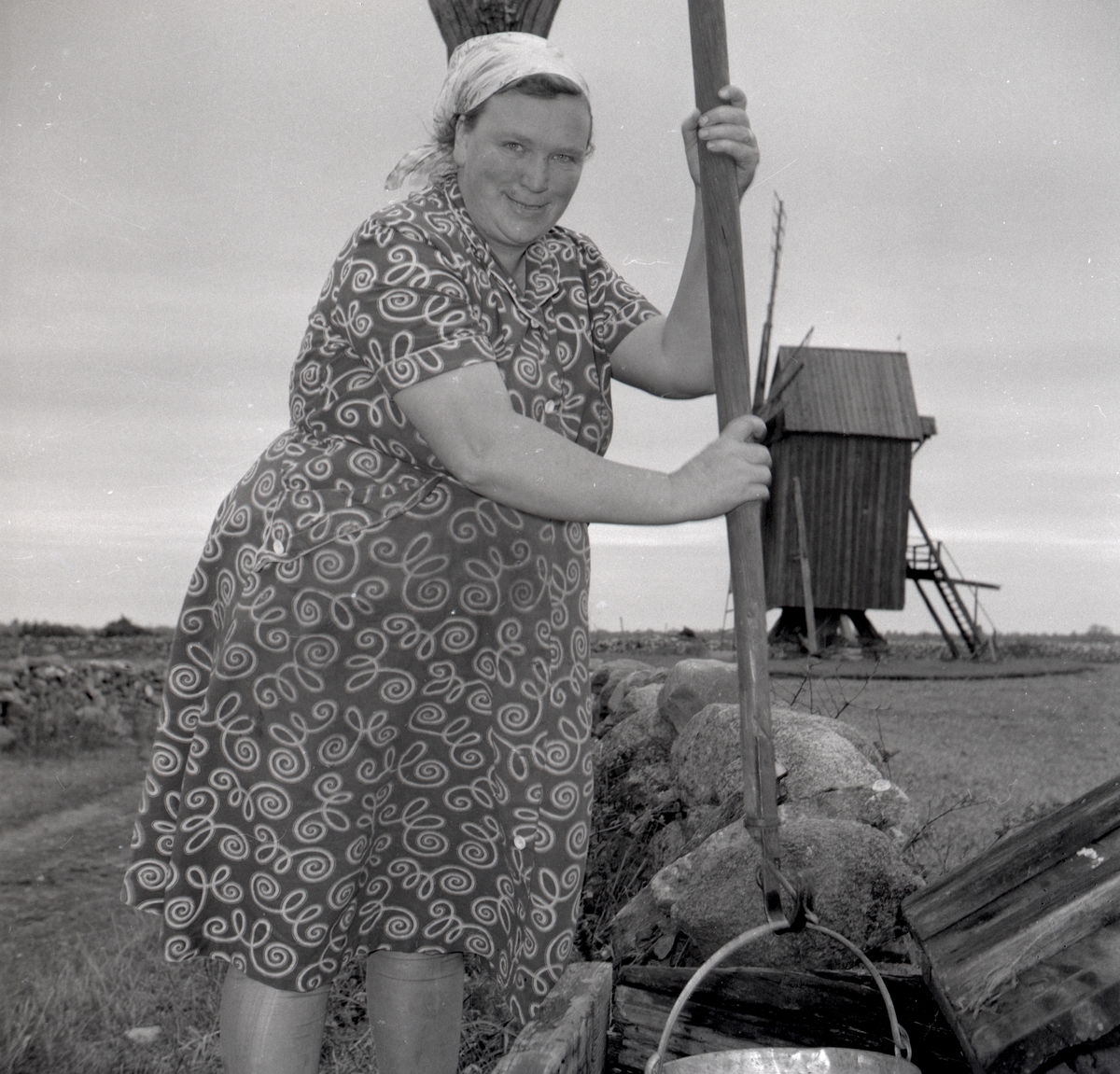Vy från torpet "Odins flisor", en kvinna hämtar vatten ur brunnen.