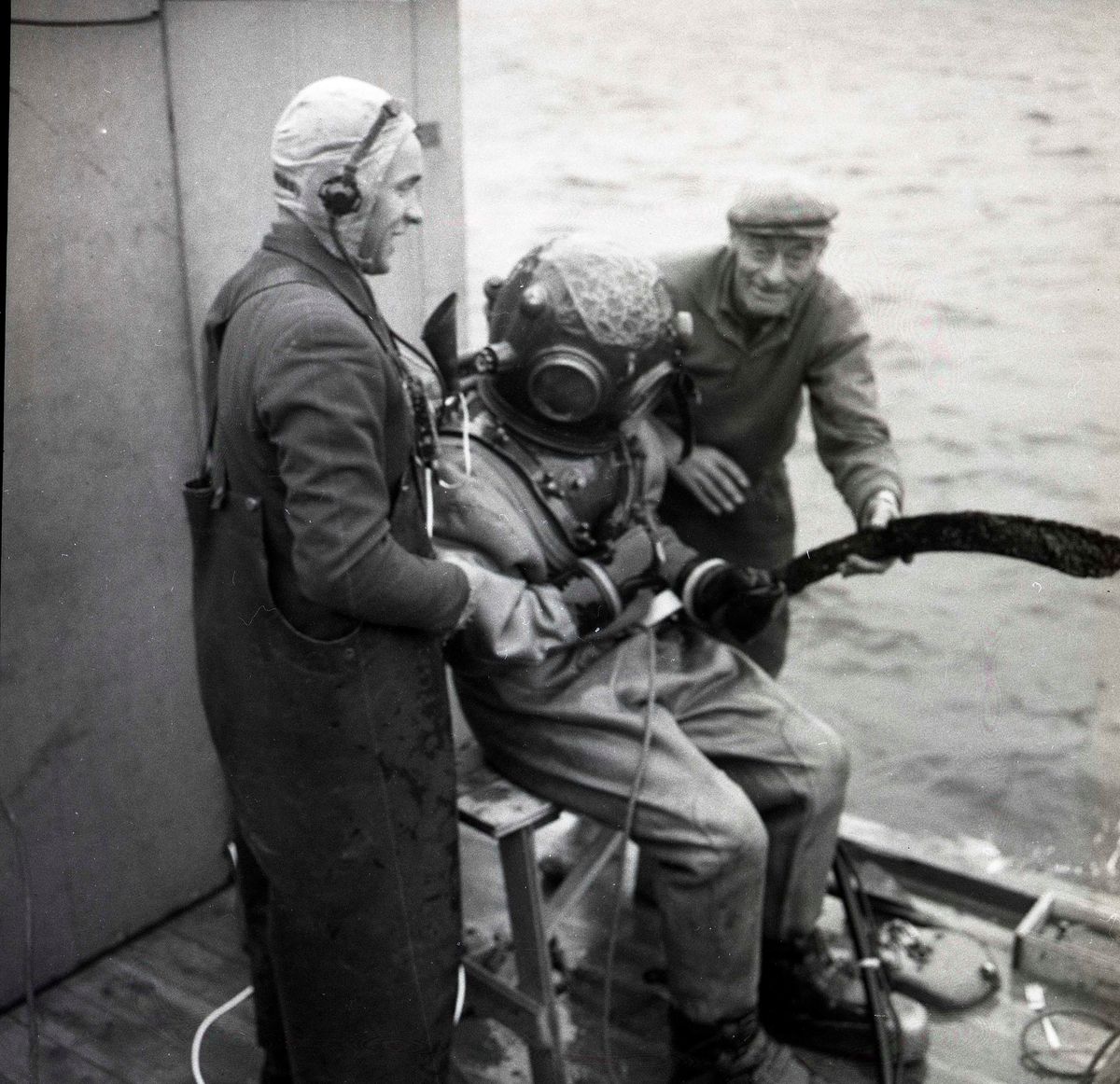 Titel: Dykare Allan Johansson och medhjälpare Ture Svensson 16/10 1957.