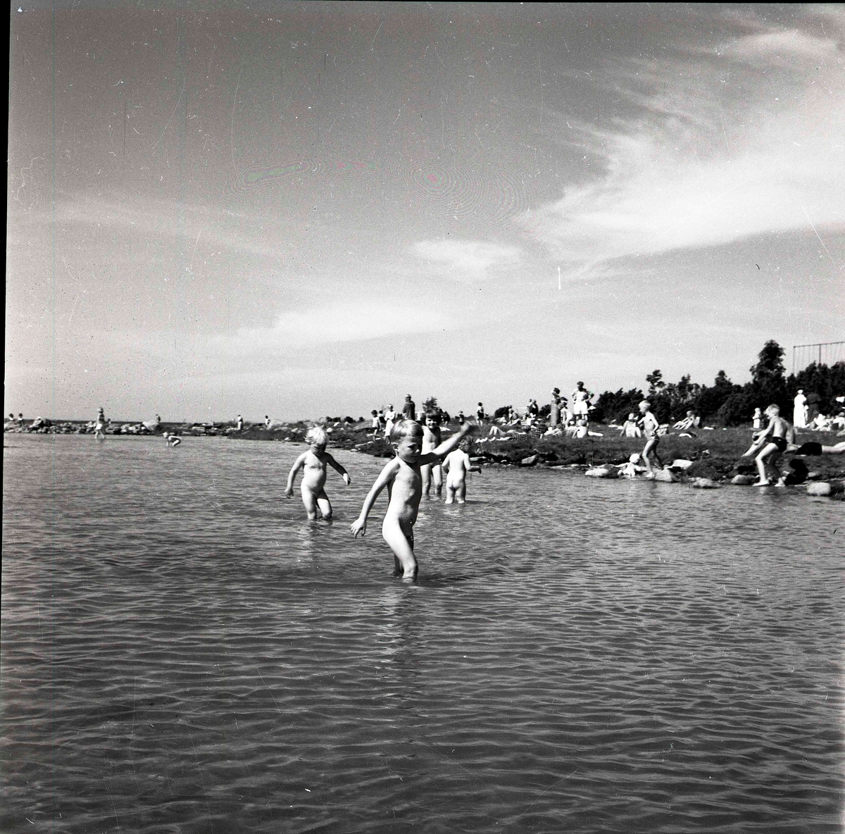Barn som badar vid en badstrand som är belägen i närheten av en sjöstuga.