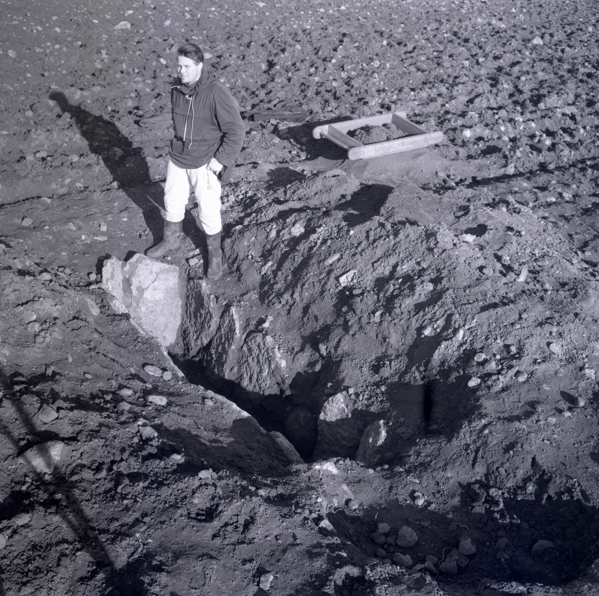 Antikvarie Ulf Erik Hagberg vid Störlinge 4/11 1964 bakom en hällkista.
