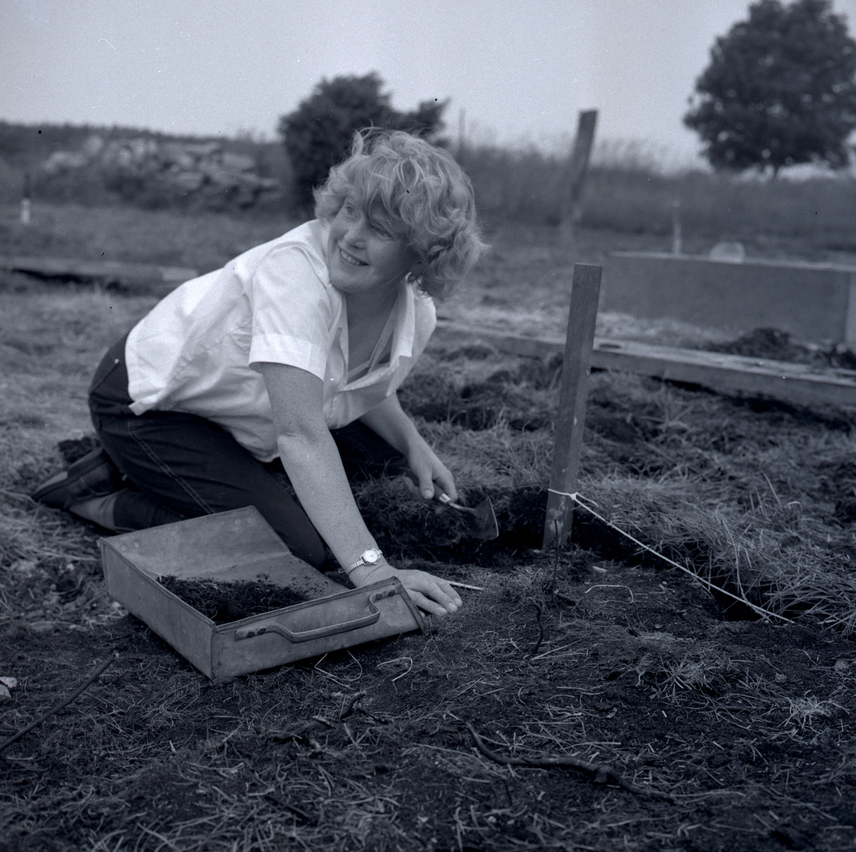 Margareta Beskow gör en arkeologisk undersökning i Skedemosse, 20 juli 1962.